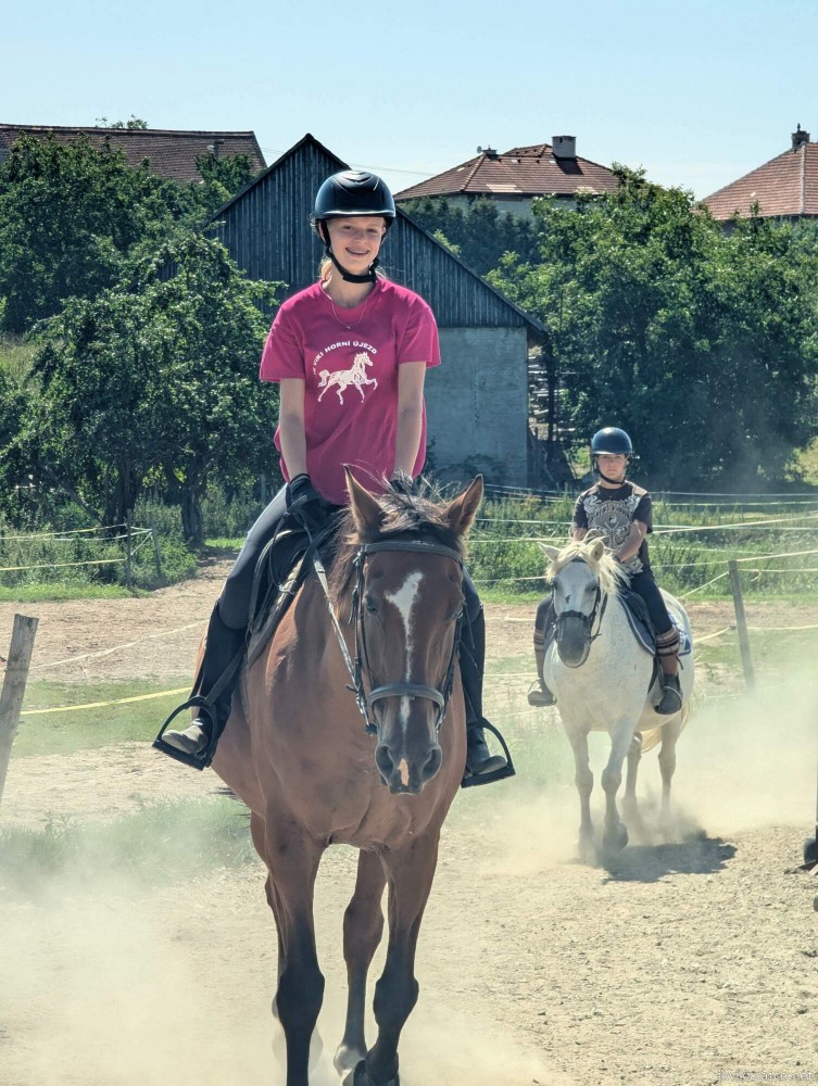 Pro všechny děti, které milují koně a přírodu, je v rodinném prostředí venkovského statku opět připraven bohatý program u koní. Jezdecké tábory v Horním Újezdě mají více než dvacetiletou tradici a za tu dobu si u nás prázdniny užily stovky dětí. Náplní tábora je především svět koní ve všech jeho podobách. Děti už od šesti let učíme jízdě na koni hravou a bezpečnou formou. Začátečníci jezdí na lonži, učí se rovnováze, správnému sedu a základům ovládání koně. Pro pokročilejší je připravena výuka drezurního i parkurového ježdění. Součástí programu je také každodenní péče o koně – čištění, sedlání i úklid, aby si děti vyzkoušely, co všechno péče o koně obnáší. Tábor ale není jen o koních. Když si koníci odpočívají, děti vyrážejí do přírody, na koupaliště, hrají hry a zapojují se do celotáborové hry. Děti si s sebou mohou přivézt také své Hobby Horse koníky, se kterými budou trénovat a hrát si ve volném čase. Těšíme se na všechny děti, které se k nám každý rok rády vracejí, i na nové táborníky, kteří se chtějí naučit jezdit na koni a zatím s koňmi nemají žádné zkušenosti. Přijďte mezi nás a zažijte prázdniny, na které se nezapomíná.